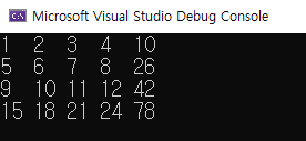 6. 다음과 같이 배열을 채우는 프로그램을 작성한 후, 맨 오른쪽 열과 맨 아래 행에 각각 행과 열의 합을 저장하는 프로그램을 작성하세요.