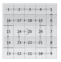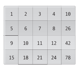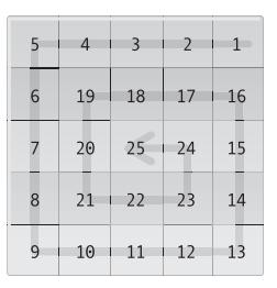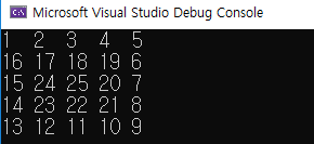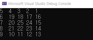 4. int형 2차원 배열(5행 5열)을 선언하여 다음과 같이 값을 채우는 프로그램을 작성하세요.